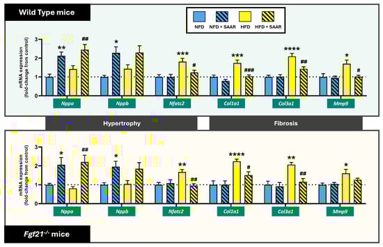SAAR modulated the expression of genes associated with cardiac hypertrophy and fibrosis pathways in both genotypes. mRNA expression levels were quantified via RT-PCR (n = 7–11 animals per group). Statistical analysis was performed using one-way ANOVA followed by Tukey–Kramer post-hoc multiple comparison tests. Significance levels to the NFD group are denoted by the * symbol: * p < 0.05, ** p < 0.01, *** p < 0.001, **** p < 0.0001. Significance levels to the HFD group are denoted by the # symbol: # p < 0.05, ## p < 0.01 and ### p < 0.001.