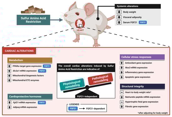 Background/Objectives: Dietary sulfur amino acid restriction (SAAR) elicits various health benefits, some mediated by fibroblast growth factor 21 (FGF21). However, research on SAAR’s effects on the heart is limited and presents mixed findings. This study aimed to evaluate SAAR-induced molecular alterations associated with cardiac remodeling and their dependence on FGF21. Methods: Male C57BL/6J wild-type and FGF21 knockout mice were randomized into four dietary regimens, including normal fat and high-fat diets (HFDs) with and without SAAR, over five weeks. Results: SAAR significantly reduced body weight and visceral adiposity while increasing serum FGF21 levels. In the heart, SAAR-induced molecular metabolic alterations are indicative of enhanced lipid utilization, glucose uptake, and mitochondrial biogenesis. SAAR also elicited opposing effects on the cardiac gene expression of FGF21 and adiponectin. Regarding cellular stress responses, SAAR mitigated the HFD-induced increase in the cardiac expression of genes involved in oxidative stress, inflammation, and apoptosis, while upregulating antioxidative genes. Structurally, SAAR did not induce alterations indicative of cardiac hypertrophy and it counteracted HFD-induced fibrotic gene expression. Overall, most alterations induced by SAAR were FGF21-independent, except for those related to lipid utilization and glucose uptake. Conclusions: Altogether, SAAR promotes cardiac alterations indicative of physiological rather than pathological remodeling, primarily through FGF21-independent mechanisms.