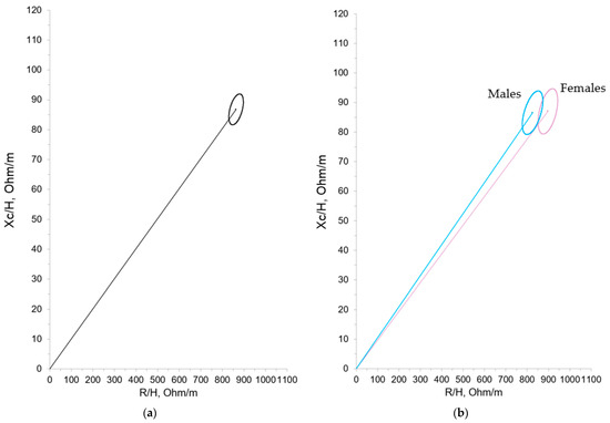 Statistically significant differences were found according to gender for the raw R, supporting the construction of both total and separate (males and females) 95% confidence ellipses of the mean impedance vector (Figure 2a,b).
