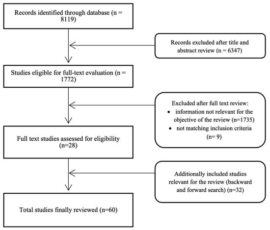 For this narrative review, PubMed was queried for relevant studies conducted from inception to 30 June 2024, using the following terms: “Lynch syndrome”, “mismatch repair”, “hereditary colorectal cancer”, “MLH1”, “MSH2”, “MSH6”, “PMS2”, “EPCAM”, and “diet” and/or “nutrition”, and/or “obesity”, and/or “weight status” to identify pertinent publications exploring the influence of diet and weight status/obesity in the risk of CRC in patients with Lynch syndrome. The articles included in this review are original retrospective and prospective cohort studies, randomized controlled trials, and systematic reviews/metanalyses; all are written in English. Additionally, a backward search of the references of the identified articles also retrieved some other relevant articles. Similarly, a forward search found recent articles that cited the screened papers. Animal studies were excluded. Figure 1 illustrates the selection process.