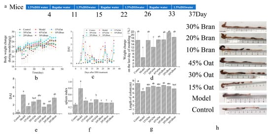 - Bai, J.Y.; Zhao, J.J.; AL-Ansi, W.; Wang, J.; Xue, L.M.; Liu, J.X.; Wang, L. Oat β-glucan alleviates DSS-induced colitis regulating gut microbiota metabolism in mice. Food Funct. 2021, 12, 8976–8993. [Google Scholar] [CrossRef] [PubMed]