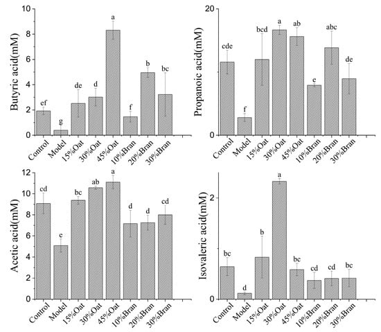 3.4. Effect of Oat and Oat Bran on the Content of SCFAs in Mouse Colon Tissue