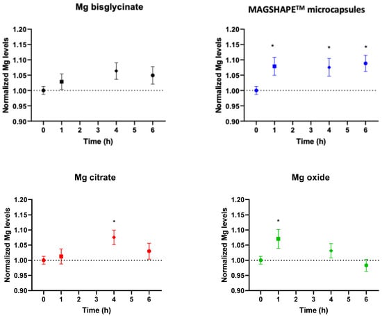 We evaluated the Mg levels in blood plasma upon the oral intake of a microencapsulated MgO ingredient (Mg-MS), compared with other common Mg forms such as Mg oxide (MgO), Mg citrate (Mg-C), and Mg bisglycinate (Mg-BC). Figure 1 shows the Mg levels in plasma for each sample at each time point, normalized to the baseline (Time 0 h, before oral intake) levels. Data expressed as mg L−1 are shown in Figure S1. When volunteers ingested Mg-MS, the levels of Mg in plasma increased at all tested time-points; specifically, Mg levels increased by 7.9%, 7.5%, and 8.8% after 1 h, 4 h, and 6 h of the oral intake, respectively (Figure 1 and Figure S1). On the other hand, the increase in plasma Mg after oral intake of Mg-BG was not significant at any of the time points evaluated. Oral supplementation with Mg-C increased Mg levels in plasma after 4 h by 7.5%, while Mg levels increased at 1 h by 7.1% upon oral intake of MgO (Figure 1 and Figure S1).