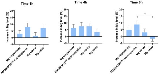 Bar graph representation of the increase in Mg levels in plasma in percentage (%) after 1, 4, and 6 h of the oral intake compared to the basal levels for each tested product. Data are represented as mean ± S.E.M. Asterisks indicate statistically significant differences compared to basal levels (0 h) as * p-value < 0.05.