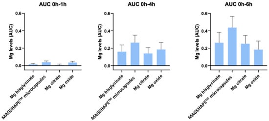 In order to compare the effect of the tested Mg sources on the plasma Mg levels in more detail, we delimited different time intervals in the curves represented in Figure 3 and calculated the area under the curve (AUC) as a measure of the total amount of Mg in plasma. In particular, we calculated the AUC for the whole study period (i.e., 6 h) and for the following time intervals: 0 h–1 h, 0 h–4 h, and 0 h–6 h. Then, the calculated AUCs were compared between the tested samples (Figure 3). Our results showed that there were no statistically significant differences between the calculated AUCs of the tested Mg sources, independent of the analyzed time interval (Figure 3).