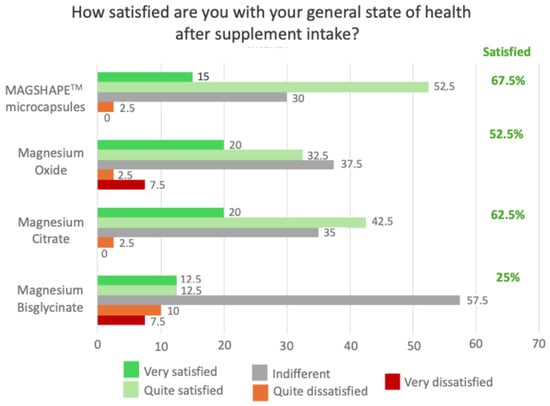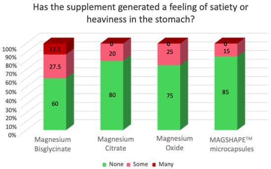 The adverse side effects and perception of the different Mg sources were subjectively evaluated using a test (self-assessment questionnaire) immediately after the oral intake of each sample and at the end of each day to evaluate their potential side effects several hours after oral intake. The results obtained at the end of the day of the oral intake are presented in Figure 4 and Figure 5. Our results showed that, compared to Mg-MS, volunteers reported increased intestinal flow with MgO and Mg-C and increased stomach heaviness with Mg-BG and MgO (Figure 4). Moreover, 67.5% of the volunteers reported that they were satisfied with their state of health after the consumption of Mg-MS, a percentage higher than the other Mg sources (Figure 4 and Figure 5); on the other hand, 70% of the volunteers reported that they were either very satisfied or quite satisfied with the format of the Mg-MS product, a percentage higher than the other Mg sources (Figure 4 and Figure 5).