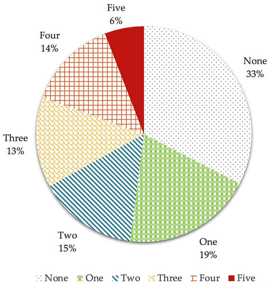 Nearly 67% of the patients had at least one clinically relevant altered eating behavior according to the EBA-O (mean score ≥ 4) (Figure 1). The frequency of participants with one, two, three, four, or five pathological eating behaviors was, respectively, 19%, 15% 13%, 14%, and 6%. No effect of the BMI (χ2 = 15.033, df = 10, p = 0.131) or sex (χ2 = 7.094, df = 5, p = 0.214) category on the number of AEBs was evident.