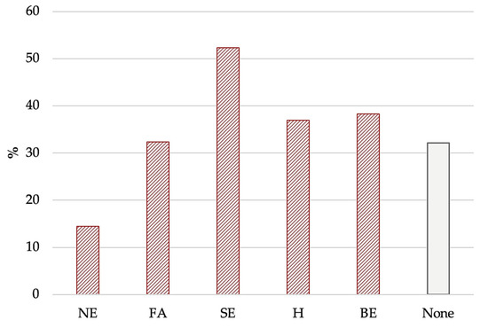 Frequencies of AEBs according to EBA-O. Frequencies of altered eating behaviors according to EBA-O (cut-off ≥ 4). Sweet eating (52%) and night eating (14%) were the most and least frequently reported AEBs, respectively. The column in light grey represents the percentage of patients without altered eating behaviors (EBA-O scores < 4). Abbreviations: BE: binge eating; FA: food addiction; H: hyperphagia; NE: night eating; SE: sweet eating.