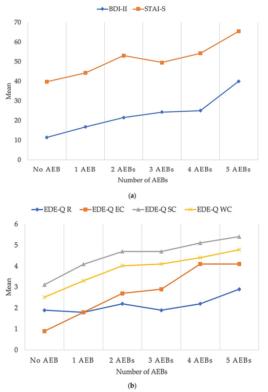 Severity of affective (a) and eating (b) psychopathology with an increasing number of AEBs. Abbreviations: BDI-II: Beck Depression Inventory; EDE-Q: Eating Disorder Examination Questionnaire; EDE-Q EC: eating concern; EDE-Q R: restraint; EDE-Q SC: shape concern; EDE-Q WC: weight concern; STAI-S: State Anxiety Inventory.