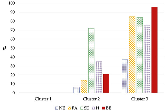 AEB distribution in the three clusters. Cluster 1: no altered eating behavior (AEB); Cluster 2: a few AEBs—with prevalent sweet eating; Cluster 3: many AEBs. Abbreviations: BE: binge eating; FA: food addiction; H: hyperphagia; NE: night eating; SE: sweet eating.