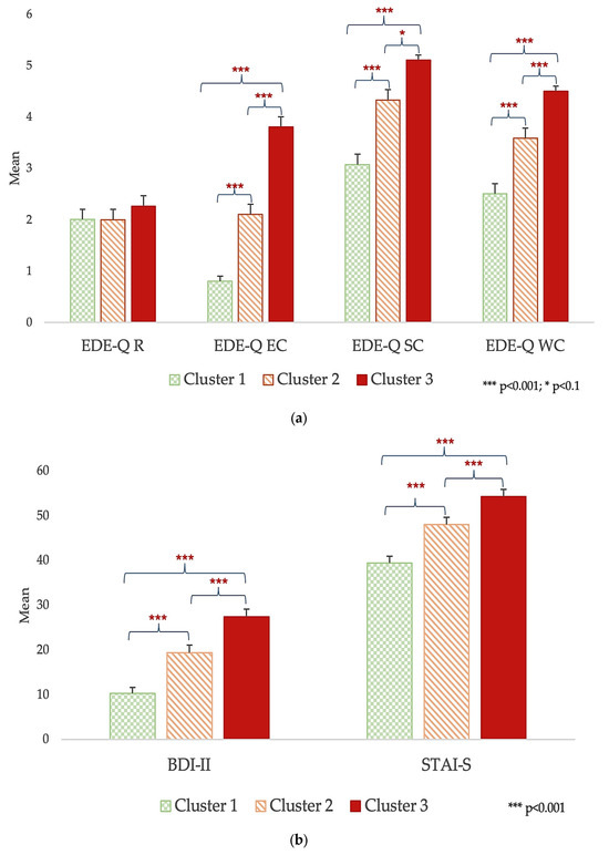The MANOVA also revealed other significant differences between clusters (F = 9.879, p < 0.001, η2 = 0.275): Cluster 3 had significantly higher scores in the EDE-Q EC (F = 62.621, p < 0.001, η2 = 0.438), EDE-Q SC (F = 23.942, p < 0.001, η2 = 0.229), EDE-Q WC (F = 33.539, p < 0.001, η2 = 0.294), STAI-S (F = 16.104, p < 0.001, η2 = 0.167), and BDI-II (F = 24.944, p < 0.001, η2 = 0.237) (Figure 5). No significant differences were evident in the EDE-Q R (F = 0.822, p = 0.441).