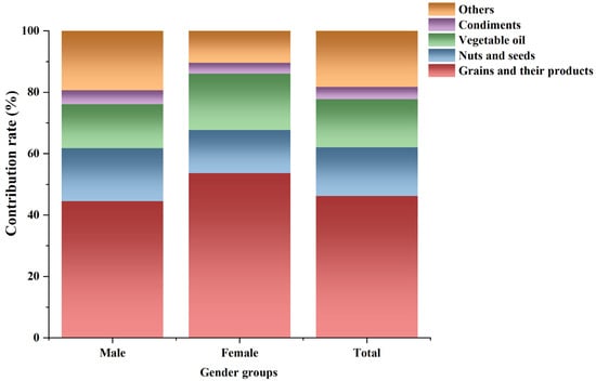As listed in Table 5, at both the mean and high (P95) AF contamination levels in food, the LADDR for total population in Sichuan ranged from 9.77 (LB) to 26.0 (UB) ng/kg bw/day and from 22.1 to 85.5 ng/kg bw/day, respectively. Regardless of whether AF contamination levels in food were at the mean or high, the LADDR for males (9.44–25.0 ng/kg bw/day and 20.6–83.4 ng/kg bw/day) in Sichuan was higher than that of females (8.74–21.2 ng/kg bw/day and 18.6–61.3 ng/kg bw/day). For the percentile values of LADD, except for the P95 and P99 values of LADD under the LB estimate of the average AF contamination level and the P95 value of LADD under the LB estimate of the high AF contamination level, the LADD values for males were higher than those for females in all other cases. Except for the median LADD of the total population under the LB estimate of the average AF contamination level, which lies between the median LADD values of females and males, in all other cases, the total population LADD is higher than the LADD values for both males and females. As shown in Figure 2, among all food categories, grains and their products contributed the most to dietary exposure to ∑5AF for the whole population of Sichuan Province, accounting for 46.2%. Specifically, the contribution rate was 44.5% for males but exceeded 50% for females.