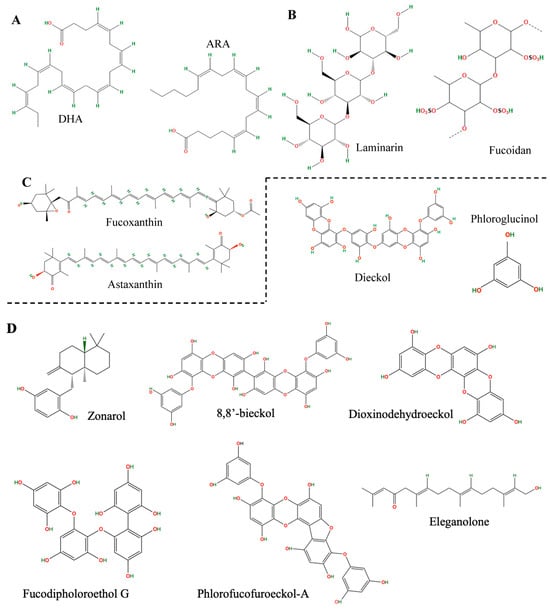 Chemical structure of some neuroprotective compounds from brown macroalgae. (A) Omega-3 fatty acids: Docosahexaenoic acid (DHA) and arachidonic acid (ARA). (B) Polysaccharides: Laminarin and fucoidan. (C) Carotenoids: Fucoxanthin and astaxanthin. (D) Polyphenols and their derivatives: Dieckol, phloroglucinol, zonarol, dioxynodehydroeckol, eleganolone, fluorofucofuroeccol-A, fucodifluoroetol G and 8,8′-bieckol.
