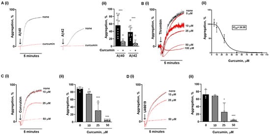 Curcumin reduces platelet aggregation induced by amyloid peptides and hemostatic agonists: (A) (i) Washed human platelets (3 × 108 platelets/mL) were preincubated with 25 µM curcumin (red curves) or vehicle (black curve) for 10 min, stimulated with 10 µM fibrillar amyloid peptides Aβ40 and Aβ42 under constant stirring, and their aggregation was monitored. (ii) The histogram shows the mean ± SEM of the % of maximal aggregation in 8 to 10 independent experiments. (B) (i) Washed human platelets were preincubated with increasing concentrations of curcumin (5 to 100 µM) (red curves) or vehicle (black curve) for 10 min at 37 °C and stimulated with 0.04 U/mL thrombin; the respective IC50 is shown in (ii). Washed human platelets (3 × 108 platelets/mL) were preincubated with increased concentrations of curcumin (10 to 50 µM) (red curves) or vehicle (black curve) for 10 min and stimulated with (C) 100 ng/mL convulxin and (D) 0.5 mM U46619, and aggregation was monitored for 5 min. Representative curves are reported in (i). The quantification of maximal aggregation is shown in (ii), as the mean ± SEM of 4 to 5 different experiments; * p < 0.05, *** p < 0.001.