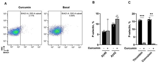 Samples of 1 × 108 washed platelets, in the presence of 1 mM CaCl2, were untreated or preincubated with curcumin for 10 min at 37 °C without stirring. The platelets were activated by agonists for 5 min in the dark, and the reaction was stopped by adding 1% paraformaldehyde. The platelet samples were then labeled with BV421-conjugated anti-human CD62P antibody (P-selectin). Platelet activation was evaluated as the percentage of P-selectin expressed on the platelet surface by using a BD FACSLyric instrument (BD Biosciences, San Diego, CA, USA) at the PASS-BioMed facility of the University of Pavia (Lombardia, Italy).