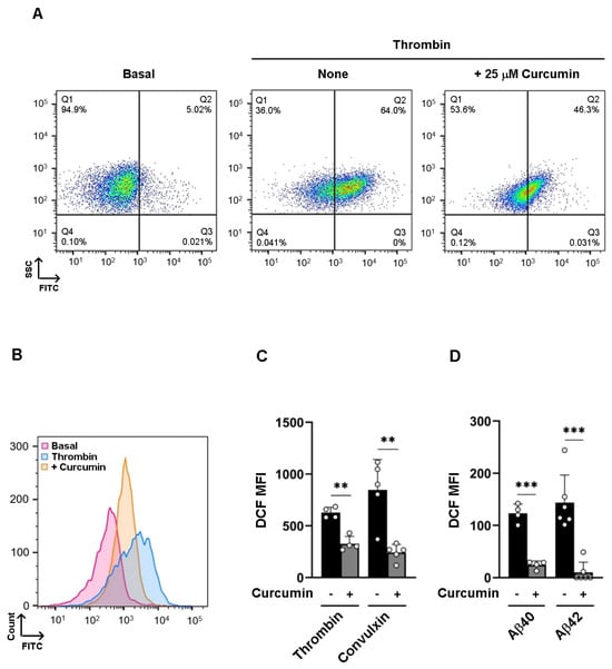 Curcumin inhibits ROS formation: Washed human platelets (1 × 108 platelets/mL) were preloaded with 10 µM H2DCF-DA for 20 min in the dark, preincubated with vehicle (none) or 25 µM curcumin (curcumin), and stimulated with 0.1 U/mL thrombin. Representative (A) dot plots and (B) curves are shown. Analysis of DCF mean fluorescence intensity (DCF MFI) measured in platelets stimulated with (C) 0.1 U/mL thrombin and 100 ng/mL convulxin, or (D) 25 µM fibrillar Aβ40 and 25 µM fibrillar Aβ42, for 15 min at 37 °C. Data are the mean ± SEM of 4 to 6 different experiments; ** p < 0.01, *** p < 0.001.