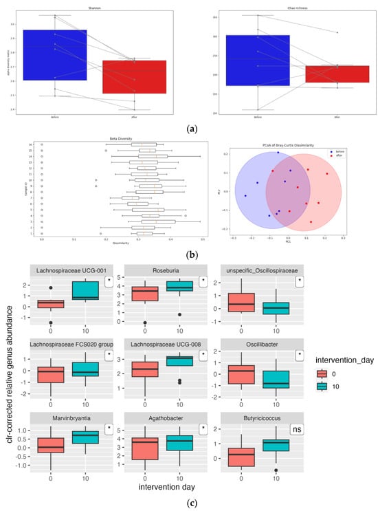 Visual representation of effects of sauerkraut supplementation on alpha and beta diversity and bacterial genera: (a) Changes in alpha-diversity metrics Shannon index and Chao richness after sauerkraut supplementation. (b) Beta diversity: distribution of Bray–Curtis dissimilarity values among samples and Principal Coordinates Analysis (PCoA). (c) Significant changes in centered-log-transformed (clr) relative abundances of bacterial genera after intervention (* indicating p < 0.05; ns non-significant).