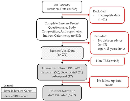Data were available from the clinic for 373 patients. After excluding those with incomplete measurements, non-adults, and those for whom the advice given could not be identified, 271 patients were eligible for Stage 1 analysis. Of those, 128 were advised to follow TRE, and 97 of them had follow-up data available for before-and-after comparison of outcomes (Figure 1).