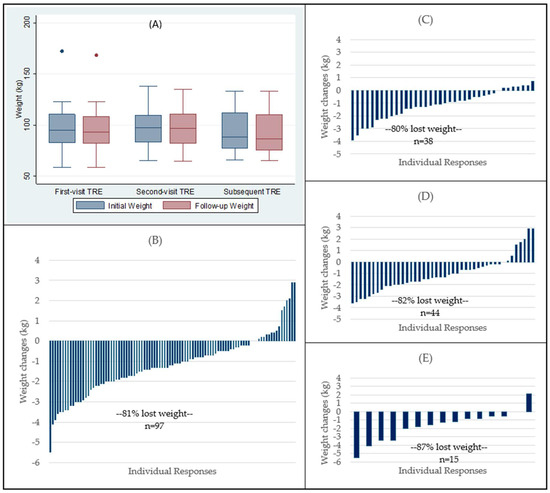 Weight changes among TRE users: Comparison of average initial and follow-up weight between different timing of TRE introduction, with dots representing outlier values (A), and individual changes among all TRE patients (B), First-visit TRE (C), Second-visit TRE (D), and Subsequent TRE (E).
