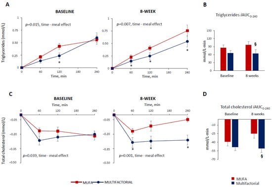Plasma triglycerides and total cholesterol responses to a test meal evaluated as increased/decreased from fasting values (Panel (A,C)) and iAUC (Panel (B,D)) at baseline and after 8 weeks of dietary intervention with the MUFA (red lines and bars) (n = 22) or multifactorial diet (blue lines and bars) (n = 21). Data are mean ± SEM. * p < 0.05 Multifactorial vs. MUFA diet, unpaired t-test; § p < 0.05 Multifactorial vs. MUFA, 8-week values are adjusted for baseline via ANCOVA.