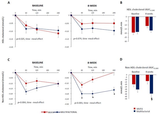 Plasma HDL cholesterol and non-HDL cholesterol responses to a test meal evaluated as increased/decreased from fasting values (Panel (A,C)) and iAUC (Panel (B,D) )at baseline and after 8 weeks of dietary intervention with the MUFA (red lines and white bars) (n = 22) or multifactorial diet (blue lines and bars) (n = 21). Data are mean ± SEM. * p < 0.05 Multifactorial vs. MUFA diet, unpaired t-test; § p < 0.05 Multifactorial vs. MUFA, 8-week values are adjusted for baseline via ANCOVA.