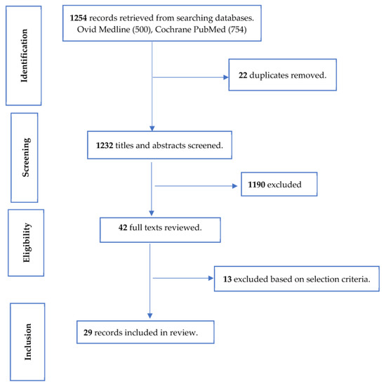 Ovid Medline and Cochrane Library (PubMed) were searched for peer-reviewed articles published between 1 January 2003 and 30 September 2022. Articles retrieved from the search were saved on Mendeley desktop software (version 1.19.8), and their titles and abstracts were screened by B.M.K. Studies that fulfilled the eligibility criteria were retained for full-text review. Reference lists of eligible studies and previous reviews were hand-searched to identify additional eligible studies. Table 1 shows the search strategy used on Ovid Medline. The same search terms were used and tailored to the specific requirements of the Cochrane Library (PubMed).