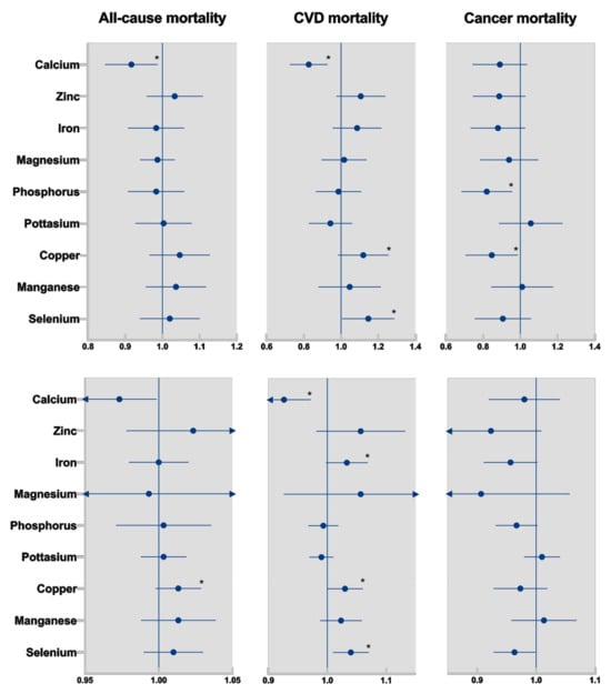 Hazard ratios and 95% confidence intervals of the highest quintile versus the lowest quintile of element intake (Top) and continuous (Bottom) in the multi-variable adjusted models. * represents a significant p-trend < 0.05.