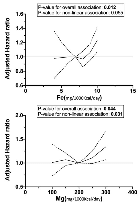 In this study, a suggestive U-shaped association between iron intake and CVD mortality was observed (Figure 2). Zhang et al. [] suggested that dietary intake of total iron was positively associated with mortality from stroke and total CVD in Japanese men, and Lee et al. [] indicated that a higher intake of heme iron might be related to CVD mortality in Iowa women. However, few studies suggested an inverse association between dietary iron intake and cardiovascular outcome []. Regarding cancer mortality and iron intake, in this study, we did not observe any significant association, which was in line with a previous study on Chinese adults [].