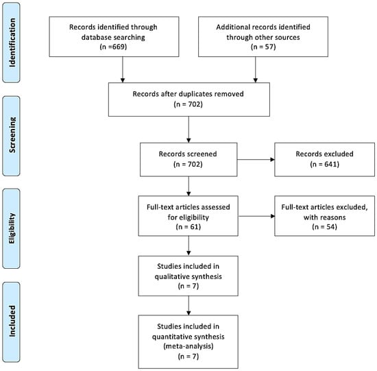 A total of 726 articles were identified, with 669 found through electronic searches and 57 from other sources. After removing duplicates, 702 studies remained for selection. Out of the 702 articles analyzed, 641 were excluded after reviewing the titles and abstracts. Eventually, out of the remaining sixty-one articles selected for full-text evaluation, seven met the inclusion criteria and were included in the qualitative and quantitative analyses (meta-analyses).