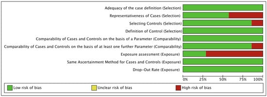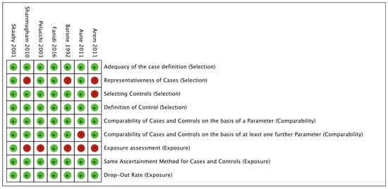 The evaluation of bias risk was performed using the Newcastle–Ottawa Scale (NOS) [] for case–control, cross-sectional, and cohort studies, whereas the Cochrane Collaboration Tool [] was used for evaluating randomized controlled trials. For the NOS, the presence of each parameter was recorded with a green circle with a “+”, while its absence was recorded with a red circle with a “−”. Articles with 1–3 stars were classified as having a high risk of bias, those with 4–6 stars as having a medium risk, and those with 7–8 stars as having a low risk. An additional analysis of the overall quality of evidence for each meta-analysis was independently conducted by the same examiners using the Grading of Recommendations, Assessment, Development, and Evaluations (GRADE) system. Any discrepancies between the two reviewers (E.F.G. and R.P.) were resolved through discussion with a supervising author (C.L.). In the case of meta-analyses with fixed-effect model, publication bias was assessed through a funnel plot, created using Review Manager (Revman), Version 5.4 [] software.