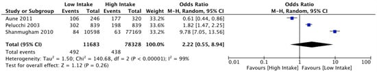 Three separate meta-analyses were conducted. The first one (Figure 4) reports data concerning studies on the correlation between folic acid and oral carcinoma. Three studies with a total of 90,011 patients were included; an odds ratio of 2.22 (C.I: 0.55–8.94) was found.
