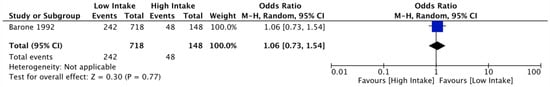 The second meta-analysis focused on the correlation between vitamin C and oral cancer and included one study with a total of 866 patients (Figure 5). The derived odds ratio was 1.06, with a confidence interval between 0.73 and 1.54.