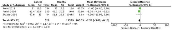 The third meta-analysis concerned the relationship between vitamin D deficiency and the incidence of oral cancer. It included three studies with a total of 12,087 patients (Figure 6). The odds ratio was −2.58, with a confidence interval between −5.06 and −0.10.