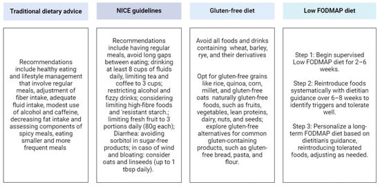 - Staudacher, H.M.; Gibson, P.R. Traditional Dietary Advice, Low FODMAP Diet, or Gluten-Free Diet for IBS: Growing Understanding but Uncertainties Remain. Clin. Gastroenterol. Hepatol. 2023, 21, 1119–1120. [Google Scholar] [CrossRef] [PubMed]