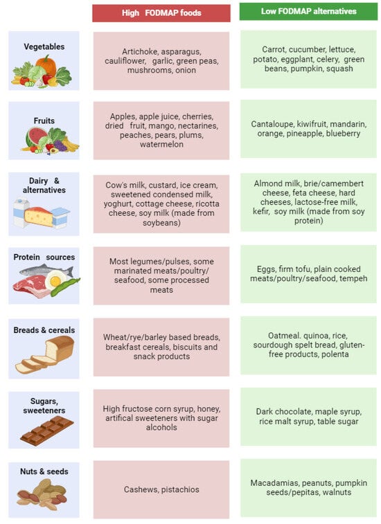 - Black, C.J.; Staudacher, H.M.; Ford, A.C. Efficacy of a Low FODMAP Diet in Irritable Bowel Syndrome: Systematic Review and Network Meta-Analysis. Gut 2022, 71, 1117–1126. [Google Scholar] [CrossRef] [PubMed]