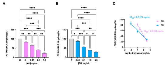 The LDL receptor interacts with a protein produced in several organs, such as the liver, kidneys, and intestines, named PCSK9. This interaction causes the activation of the catabolism of the receptor, leading to its degradation, especially in the liver [34]. We therefore evaluated whether the hydrolysates were able to inhibit this interaction. Both AH and PH can reduce PCSK9-LDLR binding with a dose–response trend (Figure 1A,B) with IC50 of 0.61 mg/mL and 0.31 mg/mL, respectively (Figure 1C).