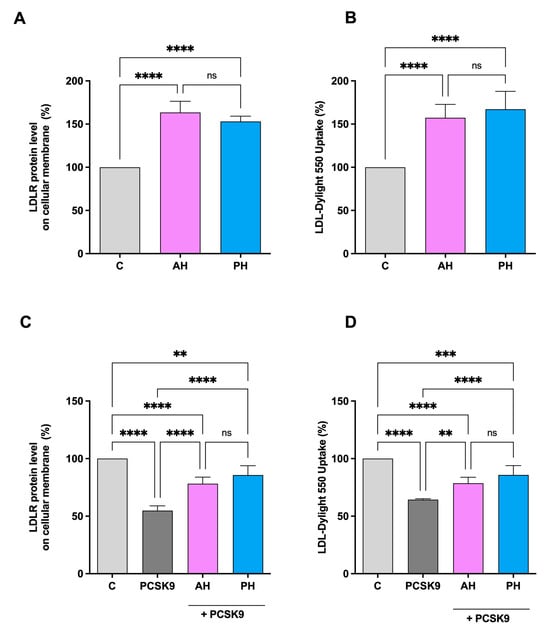 Effects of PH and AH on LDLR protein level and activity specifically located on the surface of hepatic cells. HepG2 cells were treated with AH and PH (1 mg/mL) for 24 h. The percentage of LDLR protein level was measured by ICW assay (A). The treatment of HepG2 cells with PCSK9 (4 μg/mL) reduced active LDLR protein levels localized on the surface of cells, which were restored by both AH and PH (B). Effect of AH and PH (1 mg/mL) on the HepG2 cell ability to uptake LDL from extracellular environment (C). Following PCSK9 (4 μg/mL) incubation, HepG2 cells’ functional capacity to absorb LDL from the extracellular space was diminished; in contrast, after treatment with both hydrolysates, it increased (D). Data represent the mean ± s.d. of three independent experiments performed in triplicate. Data were analyzed by one-way ANOVA followed by Tukey’s post-hoc test; (**) p < 0.01; (***) p < 0.001, (****) p < 0.0001. ns: not significant. C: control sample.