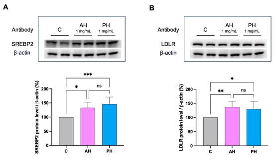 In HepG2 cells treated with AH and PH, the LDLR pathway is modulated. After the treatment of HepG2 cells with AH and PH, the SREBP-2 protein level was enhanced (A) as well as (B). Data points represent the averages ± SD of four independent experiments performed in duplicate. Data were analyzed by one-way ANOVA followed by Tukey’s post-hoc test; (*) p < 0.05; (**) p < 0.01 (***) p < 0.001. ns: not significant. C: untreated HepG2 cells.