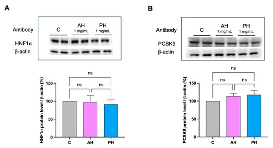 Effects of AH and PH hydrolysates on the PCSK9 pathway. AH and PH extracts did not produce any effect on the modulation of HNF1-α protein levels (A) and did not modulate PCSK9 (B). Data represent the mean ± s.d. of three independent experiments performed in duplicate. ns: not significant. C: untreated HepG2 cells.