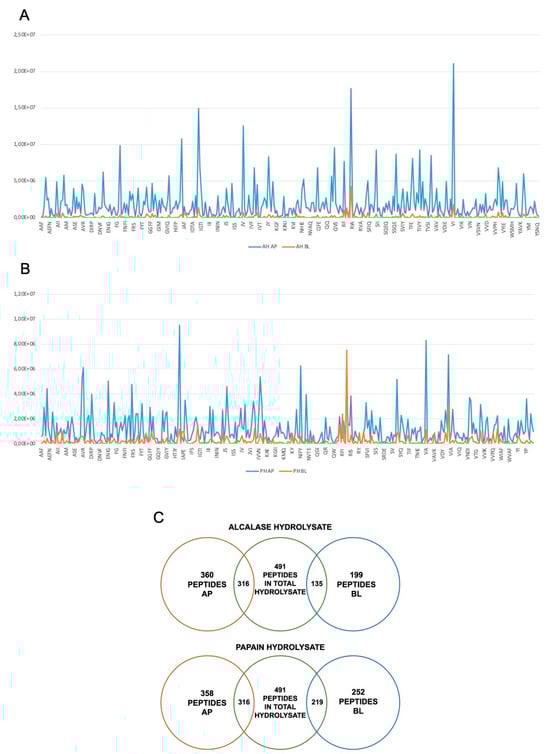 Peptides must be absorbed to carry out their biological activity, and, furthermore, they must be resistant to proteolytic hydrolysis given by the action of intestinal proteases and peptidases [36]. In fact, a study on absorption has been carried out to describe the extent to which AH and PH are absorbed by differentiated human intestinal Caco-2 cells. During the experiments, TEER values were monitored. Results indicated that both AH and PH did not alter the intestinal monolayer permeability, as depicted in Figure S1. For AH, 360 peptides in the apical (AP) side and 199 in basolateral (BL) side, whereases for PH, 358 peptides in AP and 252 in BL were identified, respectively. Compared to the original peptide mixture, 316 peptides in AP and 135 peptides in BL were identified for the AH sample. Of these, 134 stable peptides present in both AP and BL were identified for the hydrolysate with alcalase. Regarding the PH sample, 316 peptides in AP and 219 in BL were identified compared to the original mixture. Moreover, the peptides present in both AP and BL were 218 for the papain hydrolysates (Figure 7).