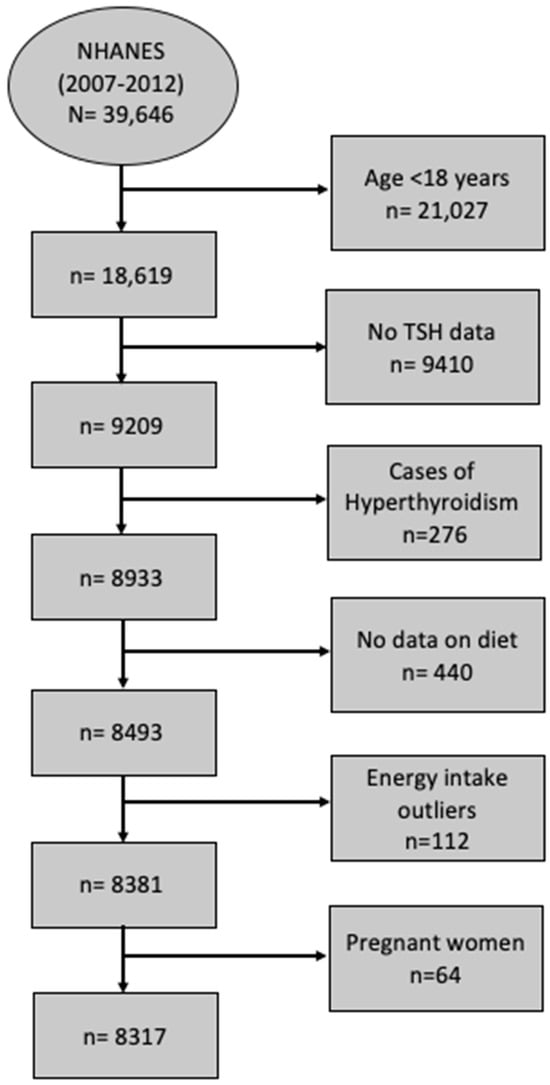 In this study, data from 3 cycles of NHANES 2007–2008 (12,943 participants), NHANES 2009–2010 (13,272 participants), and NHANES 2011–2012 (13,431 participants) are consolidated into one analytic data file (2007–2012), while accounting for the appropriate survey design and weight. In NHANES (2007–2008), 10,149 people were interviewed at home, and 9762 were examined in the mobile examination center (MEC) [23]. The MEC is a portable medical unit used to conduct various tests, examinations, and measurements to conveniently gather data from participants from different locations across the country. In NHANES (2009–2010), 10,537 people were interviewed at home, and 10,253 were examined in the MEC [24]. In NHANES (2011–2012), 9756 people were interviewed at home, and 9338 were examined in the MEC [25]. All the cycles had high response rates of more than 75%. After combining the 3 cycles, the NHANES (2007–2012) dataset had 39,646 screened participants. Participants were excluded if they were ˂18 years old (n = 11,823), had missing TSH data (n = 9410), had confirmed hyperthyroidism (n = 276), had missing dietary intake data (n = 440), were shown to be energy intake outliers (men with intakes ≤500 kcal/day and ≥6000 kcal/day and women with intakes≤ 500 kcal/day and ≥5000 kcal/day) (n = 112), or were pregnant (n = 64). The final analytic sample size was 8317 (Figure 1).
