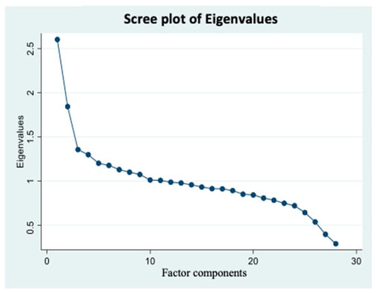 Scree plot of Eigenvalues based on the pre-determined 28 food groups’ intake frequency. Factor components are on the X axis, and their corresponding eigenvalues are on the Y axis and potential factors are on the X axis. Graph represents continuum of eigenvalues. Each dot represents a potential factor. A scree plot was used to visualize the number of factors that can be extracted. Factors with ≥1.3 eigenvalues were considered. Accordingly, three factors were extracted in the factor analysis. Data came from three cycles of National Health and Nutrition Examination Surveys 2007–2012 (n = 8317).