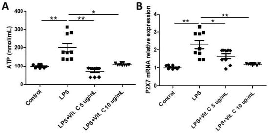 Effects of LPS stimulation and vitamin C supplementation (5 µg/mL or 10 µg/mL) on adenosine triphosphate (ATP) concentrations (A) in the K-562 cells pre-treated with vitamin C (5 µg/mL or 10 µg/mL) for 2 h and stimulated with LPS (10 ng/mL) for 24 h. Effects of LPS stimulation and vitamin C supplementation (5 µg/mL or 10 µg/mL) on the expression of mRNA of P2X7 receptor (B) in K-562 cells. All assays were performed in triplicate and repeated thrice and the mean ± standard deviations are shown. * p < 0.05 versus LPS-treated cells or * p < 0.05 versus LPS + vitamin C-treated cells. The mRNA levels were determined using real-time qRT-PCR. * p < 0.05; ** p < 0.01.