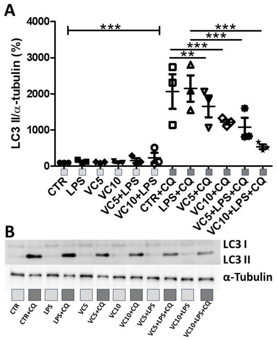 Effects of LPS stimulation and vitamin C supplementation (5 µg/mL or 10 µg/mL) on LC3-I and LC3-II expression. (A) Quantitative analysis of the expression of LC3-I and LC3-II normalized to α-tubulin. (B) Representative Western blot of the expression of LC3-I, LC3-II, and α-tubulin. CTR = control. CQ = lysosome inhibitor chloroquine. LPS = lipopolysaccharide. VC5 = vitamin C 5 µg/mL. VC10 = vitamin C 10 µg/mL. All experiments were performed in triplicate and repeated thrice. ** = p < 0.01; *** = p < 0.001. *** = p < 0.001 comparing all groups without CQ with all groups with CQ. Light gray square represent non-stimulated groups with CQ. Dark gray squares represent groups stimulated with CQ.