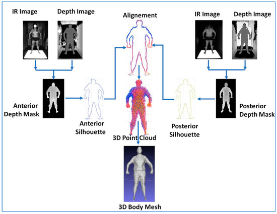 Image segmentation based on region growth and thresholding was used to detect the body shape from the IR image, which served as a mask to isolate the depth information specific to the participant’s body from the depth image to produce a depth mask image from the 3D data of the corresponding body view. Shape and depth images were fused into anterior and posterior depth masks. The shape images helped with the selection of the corresponding depth information for the body contained in the IR images. In this way, an anterior depth mask image was used to acquire depth information from the anterior IR view of the participant. Similarly, a pair of posterior depth IR images were used to obtain the body’s posterior depth information.