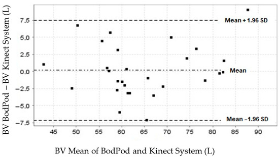 The concordance between the Bod Pod and our Kinect system measurements for BV showed a mean difference (bias) close to zero (0.16; 95% CI, −1.2 to 1.6) [32,33,34] (Table 3). The normal data distribution graphically depicted by the limits of agreement (LoA) was 7.1 to −7.5 L, set at 1.96 SD (±3.7) L (Table 3). Of the data obtained from our participants, 96.4% (27/28) were within these limits (Figure 2).