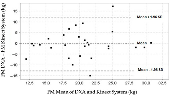 The concordance between the DXA and Kinect system measurements of FM showed a mean difference (bias) close to zero (−0.29; 95% CI, −2.7 to 2.1) (Table 4). The normal data distribution graphically depicted by the LoA was 12.1 to −12.7 kg, set at 1.96 SD (±6.3) kg (Table 4). Of the data obtained from our participants, 92.8% (26/28) were within these limits (Figure 3).
