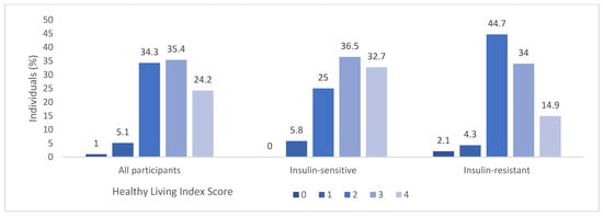 Distribution of Healthy Living Index (HLI) in all participants and in the IS and IR groups. A HLI score of zero signifies lowest adherence to health-promoting lifestyle behaviours whereas a score of four signifies highest adherence to health-promoting lifestyle behaviours.