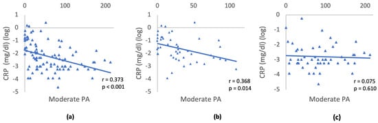 The association between CRP and moderate PA was further explored through partial correlation analysis, adjusting for gender, age, and education (Figure 2). Given the absence of differences between IR and IS individuals in the categories of diet, smoking, and alcohol consumption, no correlation with CRP was conducted. The analysis was conducted separately for the three groups: (1) All participants; (2) Individuals with IR; (3) IS individuals. For all participants, a moderately negative partial correlation was observed between CRP and PA, when controlling for gender, age, and education (r = −0.373, p < 0.001). Similarly, within the IR group, a moderately negative partial correlation was found between CRP and PA, controlling for gender, age, and education (r = −0.368, p = 0.014). In the IS group no correlation was detected between CRP and PA (r = −0.075, p = 0.610). This suggests that reduced PA is significantly linked to higher CRP levels IR individuals, while no significant correlation was evident in the insulin-sensitive group.