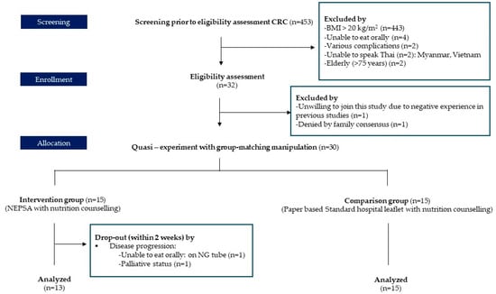 This study recruited 453 CRC patients in that period from the oncology unit. Only 32 participants passed the eligibility assessment for inclusion criteria: those who were diagnosed with CRC between 30 and 75 years old with a BMI of <20 kg/m2 who planned to receive intravenous chemotherapy, were able to eat orally, can communicate in Thai, and had a smartphone or tablet with screen time of at least 1 h per day. We excluded those with complications such as gut obstruction, brain dysfunction, gastrointestinal dysfunction, or metastasis. Additionally, we excluded those who experienced critical events. Two participants were excluded from the initial screening because their families disagreed based on negative experiences in previous studies.